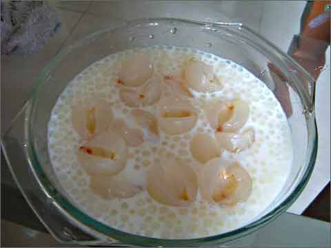 9、今天准备的是荔枝(注:大家可以因自己喜欢的水果放进冰冻的西米露里),把剥好皮的荔枝放到西米露里,最后就完成了。休 闲居 编辑