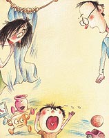 事情还没完,碗顶开食橱门跑了出来,皮球从门背后滚了出来,玩具钻出了玩具箱,还有闹钟,沿着墙壁走了下来,花瓶沿着桌腿滑下来,大家一窝蜂地向外面跑去。