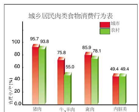 猪肉是我国居民消费的主要肉食,食用率达到94.3%,而牛羊肉、禽肉及水产品的食用频率较低。“中国居民膳食指南”指出,鱼、禽、蛋、瘦肉等动物性食物是优质蛋白质、脂溶性维生素和矿物质的良好来源。其中,鸡、鱼、牛肉等蛋白质含量较高,脂肪较低,而猪肉的脂肪含量高,应提倡多吃牛肉、禽肉及鱼肉等,适当减少猪肉的消费比例。