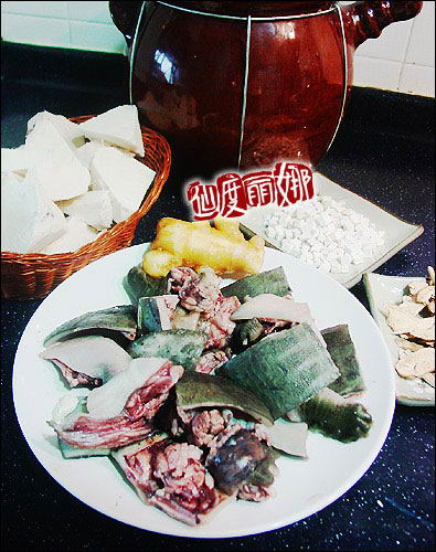 【用料】粉葛1kg左右、水鱼500g左右、姜100g、云苓50g、白朮50g。