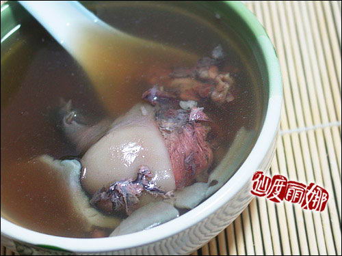四小时后,汤已经有点粘稠了,喝起来很浓的药材香味,如果不用水鱼,可以换做煲凌鱼,应该也不错!