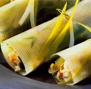 材料:大葱4根,蟹肉150克(罐头装、真空或冷冻),豆芽125克,胡萝卜200克,薄荷6根,盐、胡椒适量