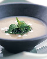 材料: 洋蓟500克、蔬菜高汤1公升(4杯)、柠檬汁1汤匙、盐及白胡椒调味、低脂酸奶油,打散1汤匙、新鲜薄荷/ 切碎1/2杯