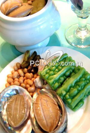 用料:凉瓜15克、黄豆10克、鲜鲍鱼一只及姜片适量(1人分量)。