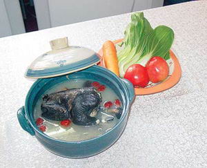 用料:花旗参5克,竹丝鸡100克,生姜1片(1人分量)。