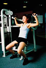 肩部塑形。动作要点:坐在椅子上,背部平贴椅背,双手握住手柄,向上推举,手臂伸直后慢慢向下放,直到肘关节与肩关节平行为止,再向上推举。