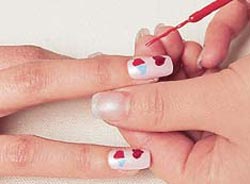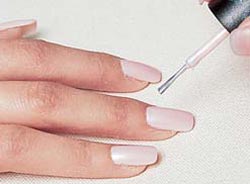 在每个甲面上依次均匀地涂抹上一层(淡粉色指甲油)。