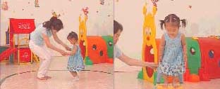 让宝宝站起来,从一些玩具中拿一样玩具给妈妈。注意,在玩的过程中要根据孩子的兴趣,若孩子喜欢。您可以让孩子反复练习去取拿东西,练习跑。若孩子不喜欢,您可让孩子休息一下看别的小宝宝活动。