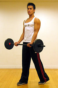 动作双脚前后站姿,腹部收紧,双手握杠把,将把向胸口放向收进。
