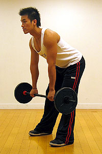起始位置双脚平行开,膝盖微弯,腹部收紧,杠把置于臀部前方。
