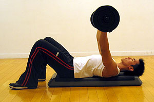 起始位置仰卧,双膝弯曲,双手抓把与胸线同齐,手肘微弯。