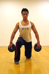 动作单膝成跪姿,身体微向前,双手各握杠片,肘部带动重量向上方。