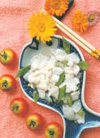 (3)炒锅中留少许油放入葱姜汁,加少许盐、黄酒、鸡精,烧开投入全部原料翻炒均匀,用水淀粉勾芡即成。