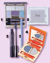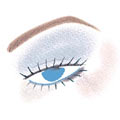 将4左下的淡珍珠色涂在眼窝,将4左上的白色在下眼睑内眼角2/3处呈倒三角形涂开,外眼角1/3处涂4中的深紫色;下眼睑画淡蓝色内眼线,让眼白显得更白更美;C区用3的白色营造高光;睫毛膏用同色系的蓝色,添加柔和的冲击力。