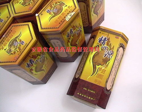 近日,安徽省滁州市药监局稽查人员市场巡查时在某药店发现:标示“阜新市第三制药厂”生产的“精生源TM锁阳固精丸”,标示批准文国药准字Z21021108,据辽宁省局通报:阜新第三制药厂《药品生产许可证》已于2004年6月30日被省食品药品监督管理局收回,因此,凡标示该企业2004年6月30日之后生产的产品,均为假药。2004年6月30日前阜新第三制药厂生产的“锁阳固精丸”批准文号为国药准字 Z21021108,该产品无其他商品名称。执法人员当即予以登记保存。