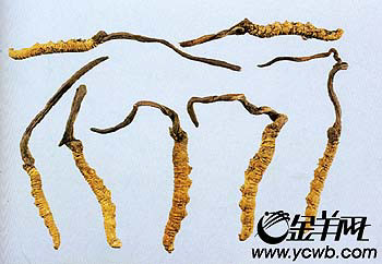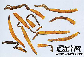 正品冬虫夏草,由真菌幼虫复合体及头部长出的真菌子座相连而成,虫体似蚕,长1.6~6.5厘米,其中长度在1.6~1.9厘米之间和长度在5.6~6.5厘米之间的冬虫夏草很少见,不足总比例的5%。直径0.3~0.8厘米,表面深黄色至黄棕色,有环纹20~30个,近头部的环纹较细,头部红棕色,全身有足8对,近头部3对,中部4对较明显,近尾部1对,尾如蚕尾,质脆,易折断,断面乳白色非纤维状,有细纵皱纹,顶端稍膨大,质柔韧,断面类白色至黄白色,有如同草菇、香菇的香气。