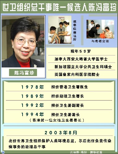 今年59岁的陈冯富珍曾长期在中国香港特别行政区政府工作,是香港第一位女卫生署长。2003年后,陈冯富珍赴世卫组织工作,主要负责传染病防控事务,成绩卓著。