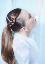 2.将剩余的头发扎成马尾辫,前额与发鬓要纹丝不乱,与发辫笔直的雕塑般的垂感相得益彰