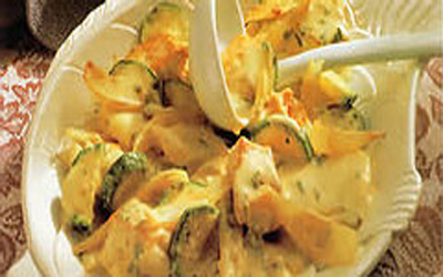 材料: 马铃薯3个、盐、鱼排(鳕鱼、鲈鱼、鲑鱼或是鲽鱼)150克、柠檬汁数滴、胡椒、洋葱2个、小的西葫芦1条(可用小黄瓜替代)、油1汤匙、水75毫升、法式鲜乳酪1汤匙、芥末2汤匙、干的龙蒿(又称香艾菊)1茶匙 。