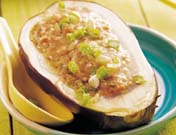 做法: 1茄子洗净,纵切两半,挖出茄肉。 2将取出的茄肉与猪肉馅一起混合剁碎,加入调味料拌匀,再将肉馅填回茄子中,放入盘中。 3准备蒸笼,待水开即将盘子放入,用大火蒸15分钟后取出。 4 蒸出的汤汁,用淀粉、水勾薄芡,淋在茄子上,并滴少许香油、撒上葱花和香菜末即成。