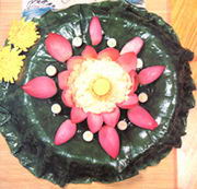 (2)葱、姜末炝锅,加入高汤、放入调料,再加入芙蓉,待开后勾芡起锅,装 入盘内的荷花中间即成。