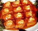 3、将锅置旺火上烧热,舀入豆油(25克),放入葱未炸香后,再放入香菇、青豆,锅端离火口,将镜箱豆腐生坯(虾仁朝下)整齐排入锅中,再移至旺火上,加绍酒(25 克)、酱油、白糖、番茄 酱、猪肉汤、精盐(2.5克)、味精,晃动炒锅,使调料溶和。