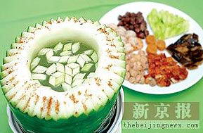 雪蛤冬瓜盅的原料多达十几种,但最后却融为一体,异常鲜美,汤汁入喉,清凉的感觉油然而生。