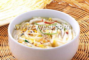 (6)把切成丝的萝卜﹑梨﹑大枣﹑栗子﹑辣椒丝放在大碗里染红色﹐并放上水芹﹑芥菜﹑细葱﹑大葱﹑蒜﹑生姜﹑石耳﹑香菇﹑虾酱拌匀后以虾酱汤调味。