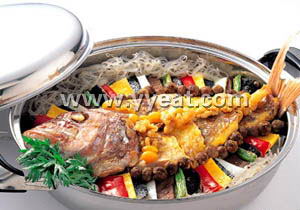 (8)使真鲷的头部向左﹐肚部向前﹐并装辣椒丝和丸子放在焖锅里焖熟。
