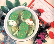 (2)锅内放入高汤、调料,烧开后放入桂鱼片、鸡片、明虾片、黄瓜片,再开后装入品锅内,然后将鸳鸯、莲蓬放在汤上面即成。