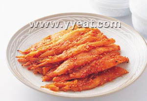 [原料/调料] 沙参200g油酱﹕酱油2小勺﹐香油2大勺。辣椒酱佐料﹕辣椒酱2大勺﹐葱2大勺﹐蒜1/2沙勺﹐芝麻1大勺﹐白糖2小勺。 [制作流程] (1)把沙参去皮后﹐泡在水里并用棒子捶好。(大的分2~3份捶。)(2)在沙参里抹匀酱油﹐放在烤架儿上﹐用文火烤出来。(3)在沙参中放辣椒酱佐料﹐将前后重新烤好﹐吃的时候﹐切成适当的大小﹐撒上芝麻。休 闲 居 编 辑