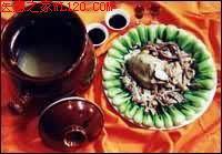 (2)制作过程 蛇宰杀、老母鸡的加工是本煲汤中的亮点。 蛇三根分别去皮、去胆、去血、去头与老母鸡一同放入大沙锅中、加水、调料、 辅料上火煲制熟即可食用。蛇皮去掉不用,但也可以做成白灼虾,椒盐蛇皮等。