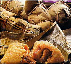 3、冬菇切碎,加精盐4克、及酱油8克,粽叶沸水滚2至3分钟,滤水排好,放入糯米,中间压出坑放肉、冬菇、笋,再放米覆盖,将淙时包严,用草绳扎牢;