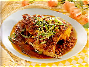 材料: 海鱼头半个(鲑鱼等海鱼均可),肉馅75克,青蒜1根,姜蒜末半大匙。