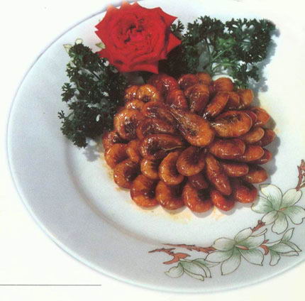 (三)在倒尽油的热锅里加入黄酒、白酱油、白糖、醋、葱末、姜汁,搅至卤汁稠粘时,将炸好的河虾倒入,速颠翻几下起锅,把虾整齐地装在盆中,放上少许香菜即好。