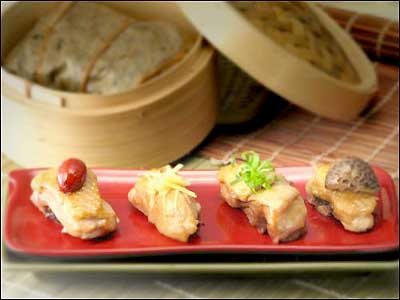 制作工艺: 1.将鸡冲洗干净之后,剔去骨,剁去爪,翅不用,再把肉劈成约2寸长,1寸宽,1分厚的大片,加调料、汤拌匀,再加炒米粉拌合均匀,干湿适度,米粉粘实。另将肥膘肉劈成一寸见方,一分厚的片备用。
