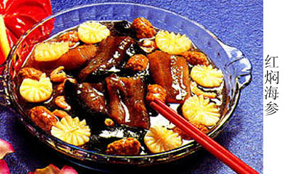 2、将猪油下鼎烧热,放入海参略炒,然后倒入锅内(锅用竹蔑垫底),顺鼎把肚肉、老鸡肉炒香,溅绍酒,加入芫荽头(扎成一把)、生蒜、酱油、红豉油、二汤、甘草片同滚然后倒入海参锅内,先用旺火烧沸,后用文火焖约1小时,再加入香菇、肉丸仔、虾米,海参软烂后去掉肚肉、老鸡肉、生蒜、芫荽头、甘草片。再把海参、香菇、肉丸仔、虾米捞起,盛入汤碗,将原汁下鼎,加入精盐、味精,烧至微沸,用湿淀粉调稀勾芡,加入芝麻油、猪油拌匀,淋在海参上面即成。上席时跟上香醋2碟。