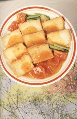 1、 豆腐去水切厚件,慢火煎至微黄色上碟。