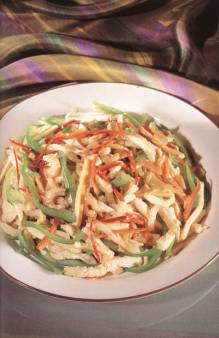 4、 榨菜洗净,切片,用清水浸5分钟,取起切丝,加入少许糖拌匀。