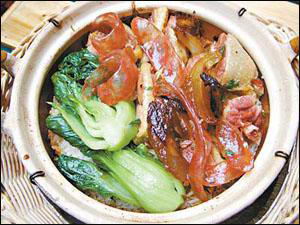 腊鸭腊味煲仔饭:腊味很香,腊鸭,用料十足,满满地盖在香喷喷的米饭上,让人看不到“米饭真面目”。腊味通常都包括腊肠、腊肉、腊鸡、腊鸭等等,各取适量,放入煮好的煲仔饭里再煲一煲,上桌时再添一勺酱油,真是吃得又方便又美味。肥瘦相间的腊味香味特佳,腊鸭一点膻味都没有,吮指仍是意犹未尽。