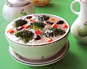 说起下厨房那可是我一大乐趣,小时候听过相声“满汉全席”后对美食可是爱之至深,那一大串的菜名报上来让你口水都能流出来。那时我就心中暗想不吃遍这“满汉全席”也要尝他个差不多。后来自己也经常去学着做做其中的菜,虽然味道总是不尽如人意,可我还是乐此不疲地做下去,从中得到的乐趣只有自己才能体会到。春节刚刚过去吃过大鱼大肉的人们是不是让自己的胃平衡一下,今天我介绍一种粥的熬制方法,大家不妨学着去做做,那样对您节后的肠胃是蛮有帮助的。我给这粥取了个名字就叫“田园粥”因为它的原料都是一些较有营养价值的素菜和精制糯米熬制而成。 煮粥,有些人认为那是一件非常简单的事,但事实并非如此。要想煮出一碗美味的粥品来可是要有一定真工夫的。清代诗人袁枚在《随园食单》中说:“见水不见米,非粥也;见米不见水,非粥也。必使水米融合,柔腻如一,而后谓之粥。”不过你也别太担心,只要按我说的去做,你也能煮出鲜美的粥来。 原料:精制糯米250克、西兰花、胡萝卜、香菇、色拉油、白糖。备其原材料后就可动手做了。 做法:首先把糯米洗净后,用凉水浸泡30分钟左右。在这个时间中,就可以把西兰花、胡萝卜、香菇都洗净切好,西兰花掰成几瓣、胡萝卜切成方丁状,香菇也是切成方丁状。等糯米浸泡差不多后就可以上锅开始煮了,在锅内加入适量清水(一般水要盖过米3至4厘米),水烧开后把糯米倒入锅内,旺火煮8至10分钟后改用温火继续煮20分钟左右,在这个过程中要间接进行搅拌,同时滴入少许色拉油。在煮粥的过程中把切好的西兰花、胡萝卜、香菇下热水锅内焯熟后捞出备用。待粥煮的时间差不多有30分钟后,加入白糖和焯熟的蔬菜煮1分钟后就可以盛碗了。 特点:口味清新、鲜滑、粥酥;含有人体所需的多种维生素和胡萝卜素,营养价值高;能开胃、增进食欲、增强肠胃功能;特别是节后肠胃有良好的调理作用。 煮粥心得 1.浸泡:煮粥前先将米用冷水浸泡半小时,让米粒膨胀开。这样做的好处:熬起粥来节省时间;搅动时会顺着一个方向转;熬出的粥酥、口感好。 2.开水下锅:那样就不会煮糊,而且它比冷水熬粥更省时间。 3.火候:先用大火煮开,再转文火即小火熬煮约20-30分钟,这样粥的香味就更浓。 4.搅拌:搅拌可以让米粒颗颗饱满、粒粒酥稠。搅拌的技巧是:开水下锅时搅几下,盖上锅盖至文火熬20分钟时,开始不停地搅动,一直持续约10分钟,到呈酥稠状出锅为止。 5.点油:粥改用温火煮约10分钟滴入少许色拉油,你会发现不光成品粥色泽鲜亮,而且入口别样鲜滑。 6.底、料分煮:这样熬出的粥品清爽不混浊,每样东西的味道都熬出来了又不串味。特别是辅料为肉类及海鲜时,更应粥底和辅料分开。 被采访者:婉儿(美容师) 文/摄 本报记者 刘钢 休 闲 居编 辑