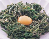 2 用2大匙油先炒香蒜末,再放入蕨菜同炒,加入所用调味料,炒熟即盛入盘内,拨开面上的菜让它微凹,铺上生蛋黄,食用时再拌匀即可。