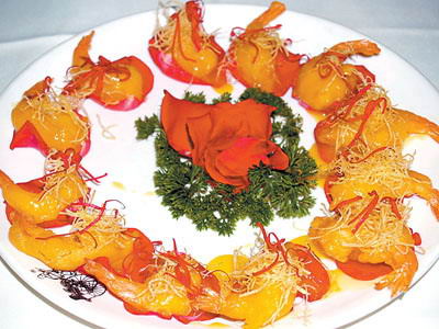 玫瑰沙拉虾:一盘菜,红红黄黄,方方圆圆,从形状上就讨人喜欢。每一只虾下面都垫着一片玫瑰花瓣,就像一件件艺术品,非常养眼。吃起来味道很好,虾是用经过秘制的酸甜酱炸过的,配上花瓣一起咬一口,玫瑰的清香和着虾的酸甜,像极了初恋的味道,百吃不腻。