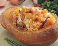 6 将1、3、4及水1米杯放入电锅内,拌匀,按下按键,煮成金瓜饭,盛入蒸熟的金瓜碗中即可。