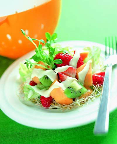 2. 将生菜铺底,水果丁置上,最后摆上草莓