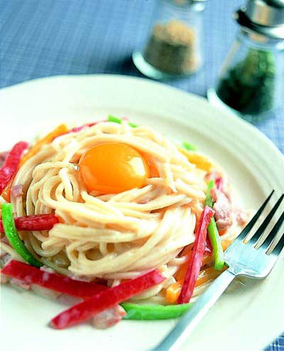 入意大利面、三色椒、雀巢美极鸡精、雀巢淡奶油,拌