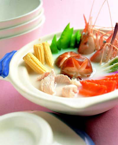 2.将高汤及雀巢植脂淡奶煮开当作锅底,加入所有材