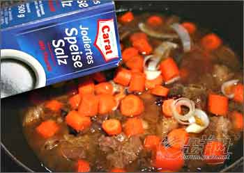 又煮了很长时间以后,这时候牛肉马上就熟了,把胡罗卜块到进去同煮,这时候在放盐,提前放盐,牛肉会紧缩,不容易熟