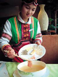 “先用滚沸的鸡鸭汤一碗(因汤汁至浓上罩浮油,故可保持其高温),再将生猪肉与鱼、腰花削为莲花瓣似的薄片,放在盘里,另以一小碟装些豆腐皮、韭菜、酱油、薄荷等作料吃的时候,先将鱼肉或腰花的薄片,放进沸汤内顷刻就热,加入各种作料最后把煮热的滑米线(即无作料之米线)放进去调而食之……”这是过桥米线六十年前的烹调方法.过桥米线昆明标志性的食品,六十年前与今天的区别已明显。当时吃法也是很讲究,汤的冷热,烫肉的时间都得注意:烫鱼片时不可过久,过久就太老,也不可太促,太促怕不易热,其久暂限度大概应以放作料为标准,因为作料放碗内,鸡鸭汤的热度马上就会锐减。