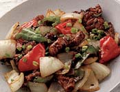 ②锅置火上,放油烧热,下入上好浆的牛肉,滑至六成熟时,倒入青、红椒片和洋葱片快速翻炒,立即盛出。